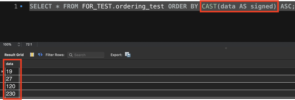 이 쿼리를 실행하면, data 컬럼의 타입이 INT였을 때와 같은 결과가 나온다. 일시적으로 signed로 변환되었기 때문이다.