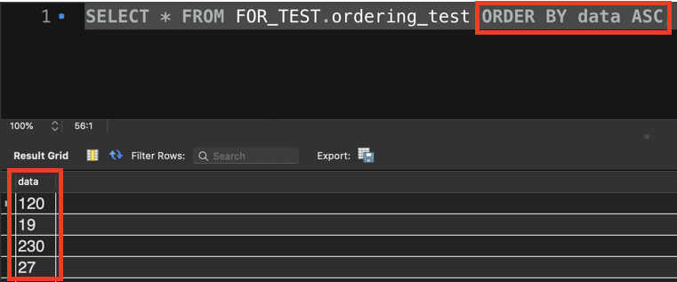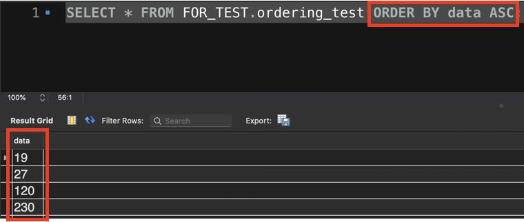 아래 그림을 보면 ordering_test라는 테이블에서 data 컬럼을 기준으로 오름차순 정렬을 하고있다.