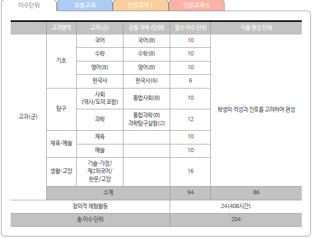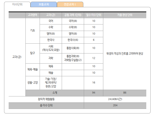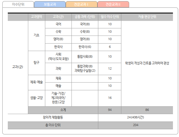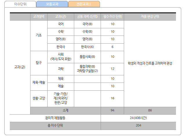 총 이수 단위 204단위 = 교과(군) 180단위 + 창의적 체험활동 24단위(408시간)