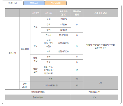 교과(군)의 총 이수 단위 180단위 중 보통교과는 66단위 이상, 전문 교과Ⅱ를 86단위 이상 편성