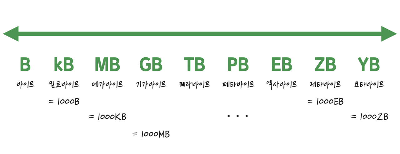 바이트 이후에는 1000단위로 킬로바이트 메가바이트등 바이트가 붙는 단위가 생긴다.사실상 일상에서 접할 수 있는 건 테라바이트 정도일 것 같지만 더 큰 단위가 있다는것도 알아두면 유용할 것 같다.